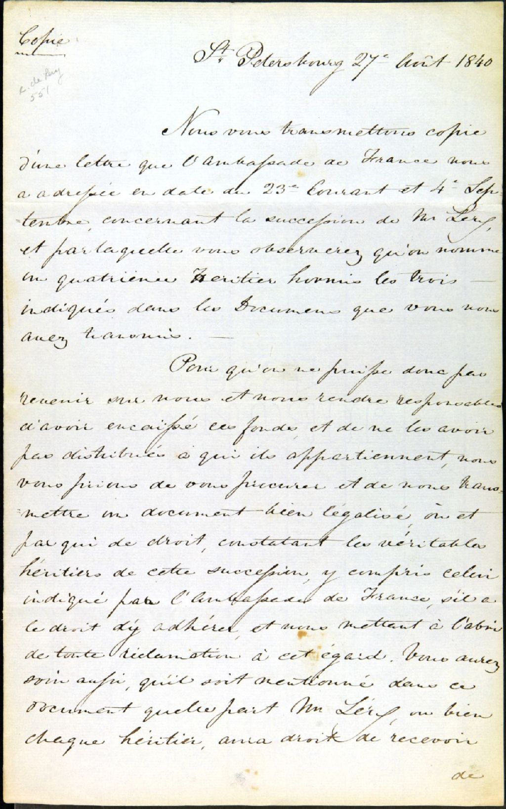 Copie d'une lettre de l'ambassadeur de France à Saint-Pétersbourg relativement à la succession de Gaspard-Roch-George Chaussegros de Léry, 27 août 1840, Archives nationales à Québec, Fonds Famille Chaussegros de Léry, (03Q,P386,D551).