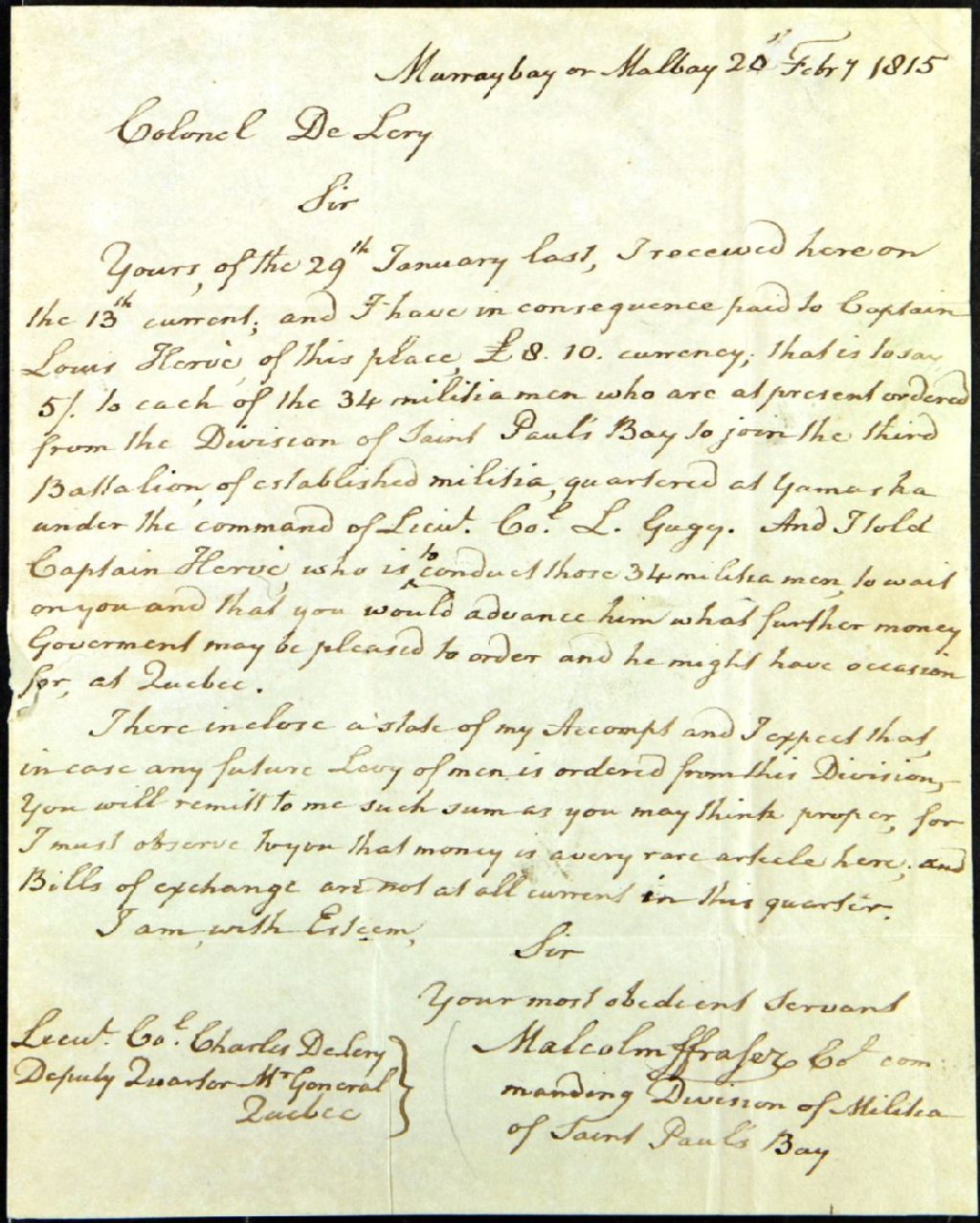 - Lettre de Malcolm Fraser, chef militaire de la Division de milice de Baie-Saint-Paul, au lieutenant-colonel Charles-Étienne Chaussegros de Léry