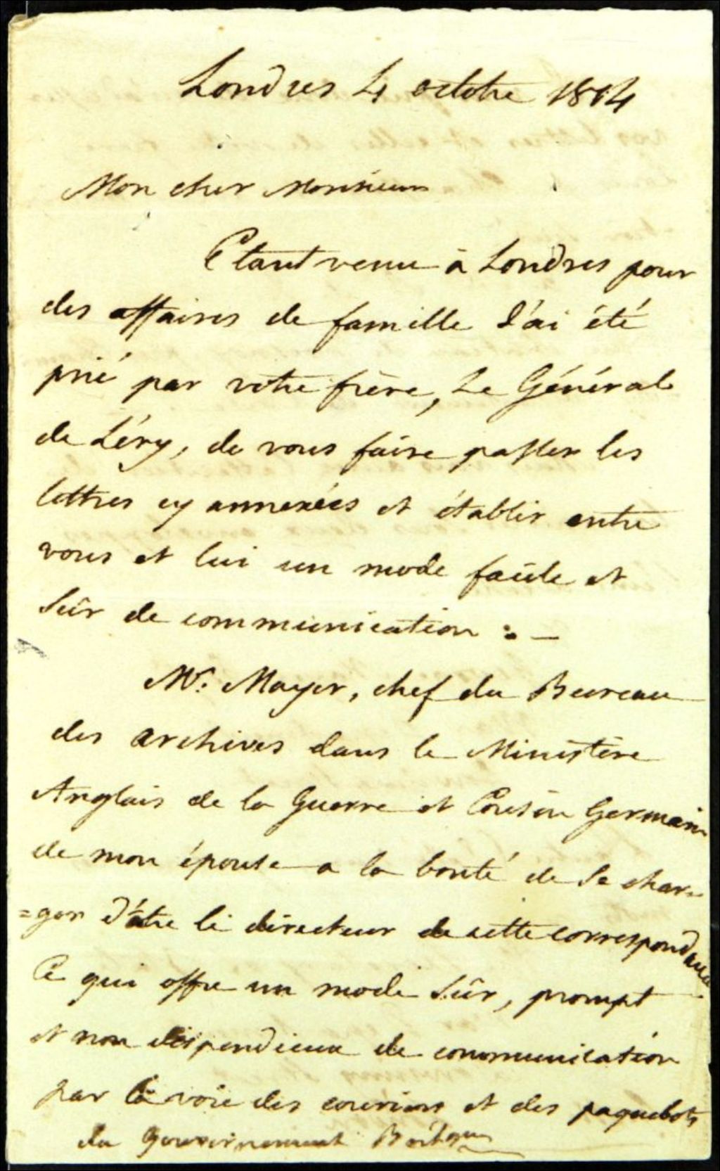 - Version intégrale légèrement normalisée : «Londres 4 octobre 1814 Mon cher monsieur, Étant venu à Londres pour des affaires de famille j'ai été prié par votre frère, le général de Léry, de vous faire passer les lettres ci-annexées et établir entre vous et lui un mode facile et sûr de communication. Monsieur Mayer, chef du bureau des Archives dans le ministère anglais de la guerre et cousin germain de mon épouse à la bonté de se charger d'être le directeur de cette correspondance. Ce qui offre un mode sûr, prompt et non dispendieux de communication par la voie des courriers et des paquebots du gouvernement britannique. Je vous prie donc de m'adresser vos lettres et celles de votre frère, Louis de Chaussegros avec l'inscription suivante : à monsieur chevalier de Léry etc. au château de Fresnoy, près Chambly, département de l'Oise. Mais vous aurez l'attention de les expédier sous deux enveloppes l'une adressée:To Georges Mayer esquire War [...]