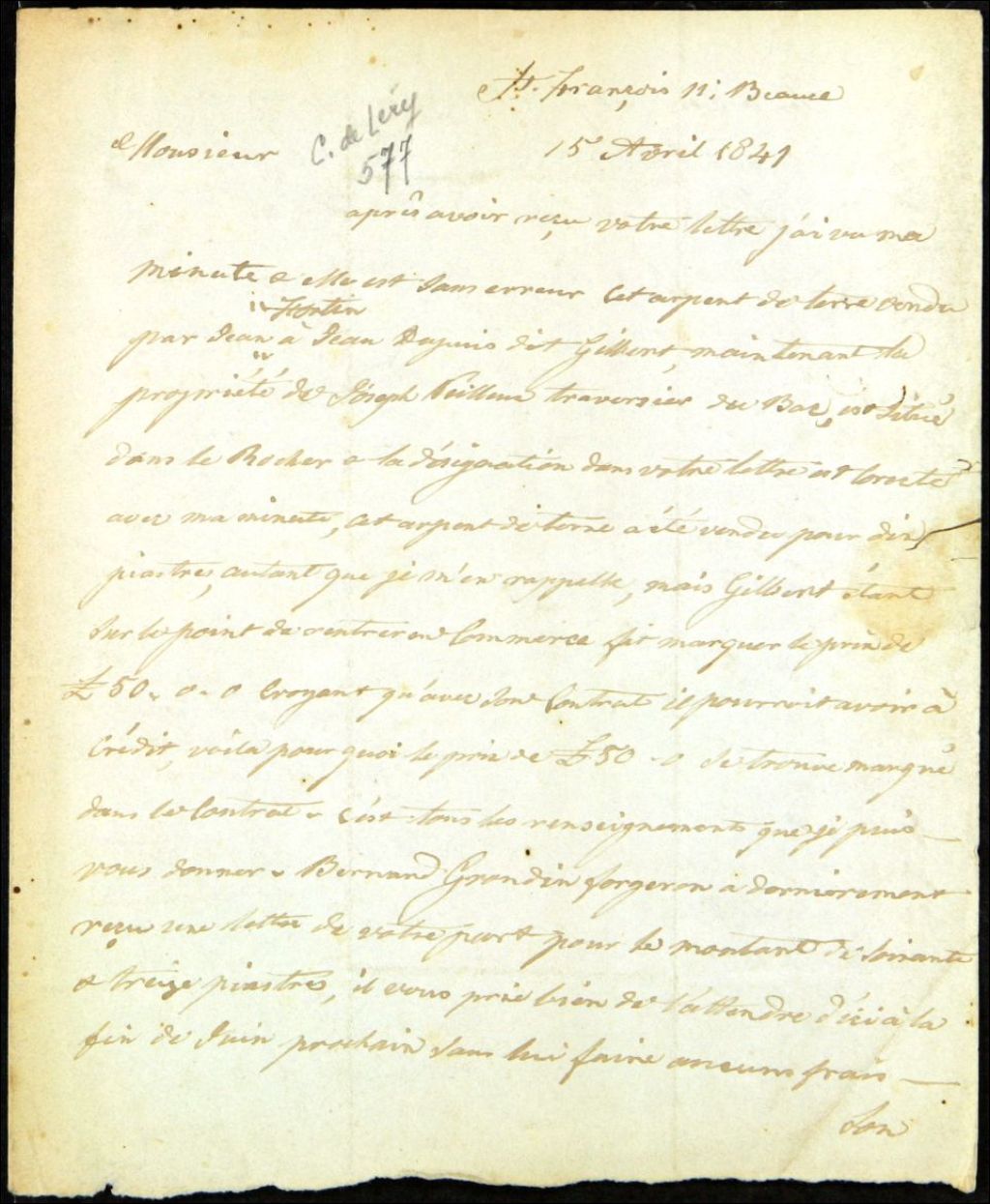 - Il l'informe des terres qui ont été vendues dans sa seigneurie; il lui écrit que Bernard Grondin lui demande d'attendre à la fin de juin pour le payer