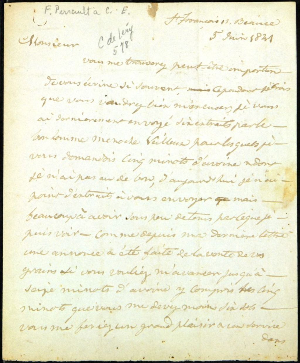 Lettre de F. Perreault à Charles-Étienne Chaussegros de Léry, 5 juin 1841, Archives nationales à Québec, Fonds Famille Chaussegros de Léry, (03Q,P386,D578).