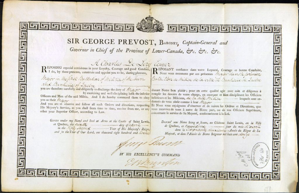 Nomination de Charles-Étienne Chaussegros de Léry comme major dans le premier bataillon de milice de la ville de Québec et de sa banlieue par Sir George Prevost, capitaine-général et gouverneur en chef de la province du Bas-Canada, 9 avril 1812, Archives nationales à Québec, Fonds Famille Chaussegros de Léry, (03Q,P386,D601).