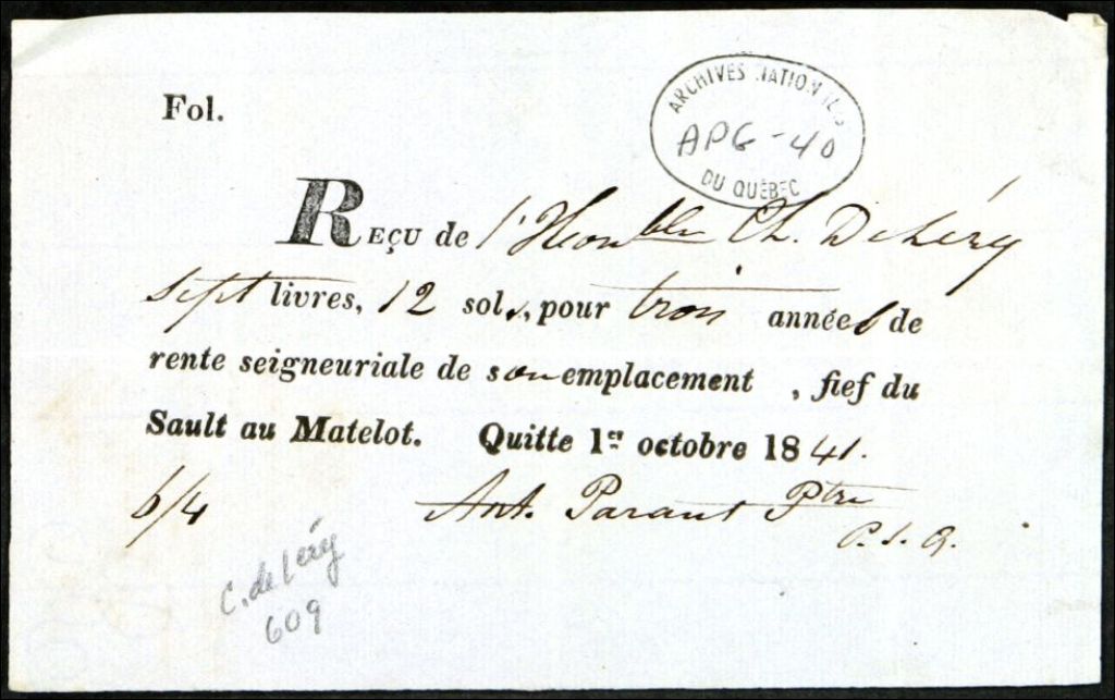 Reçu de rente seigneuriale de Charles-Étienne Chaussegros de Léry, 1er octobre 1841, Archives nationales à Québec, Fonds Famille Chaussegros de Léry, (03Q,P386,D609-C).