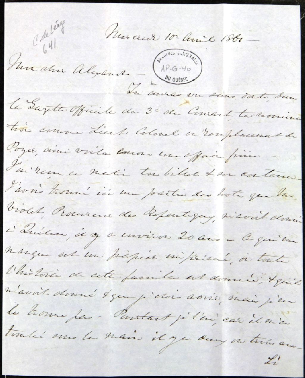 - Il lui écrit à propos de sa nomination comme lieutenant-colonel qui est écrite dans la gazette officielle du 3 avril; il a reçu son billet ce matin; il a trouvé les notes que M. Violet, procureur des Repentigny, lui a donné il y a 20 ans; il lui manque un papier sur l'histoire de cette famille; il lui écrit à propos d'un acte de vente du 1er septembre 1760 fait par madame de Repentigny; il indique que M. de Repentigny était à Paris en 1760 et qu'il n'a pas été sujet anglais; il écrit à propos des terres aux États-Unis revendiquées par des descendants de Repentigny selon un traité entre l'Angleterre et les États-Unis de 1783; il donne des nouvelles de la famille Proux (Proulx); il donne également des nouvelles du fils de David Rodrigue qui vient de mourir