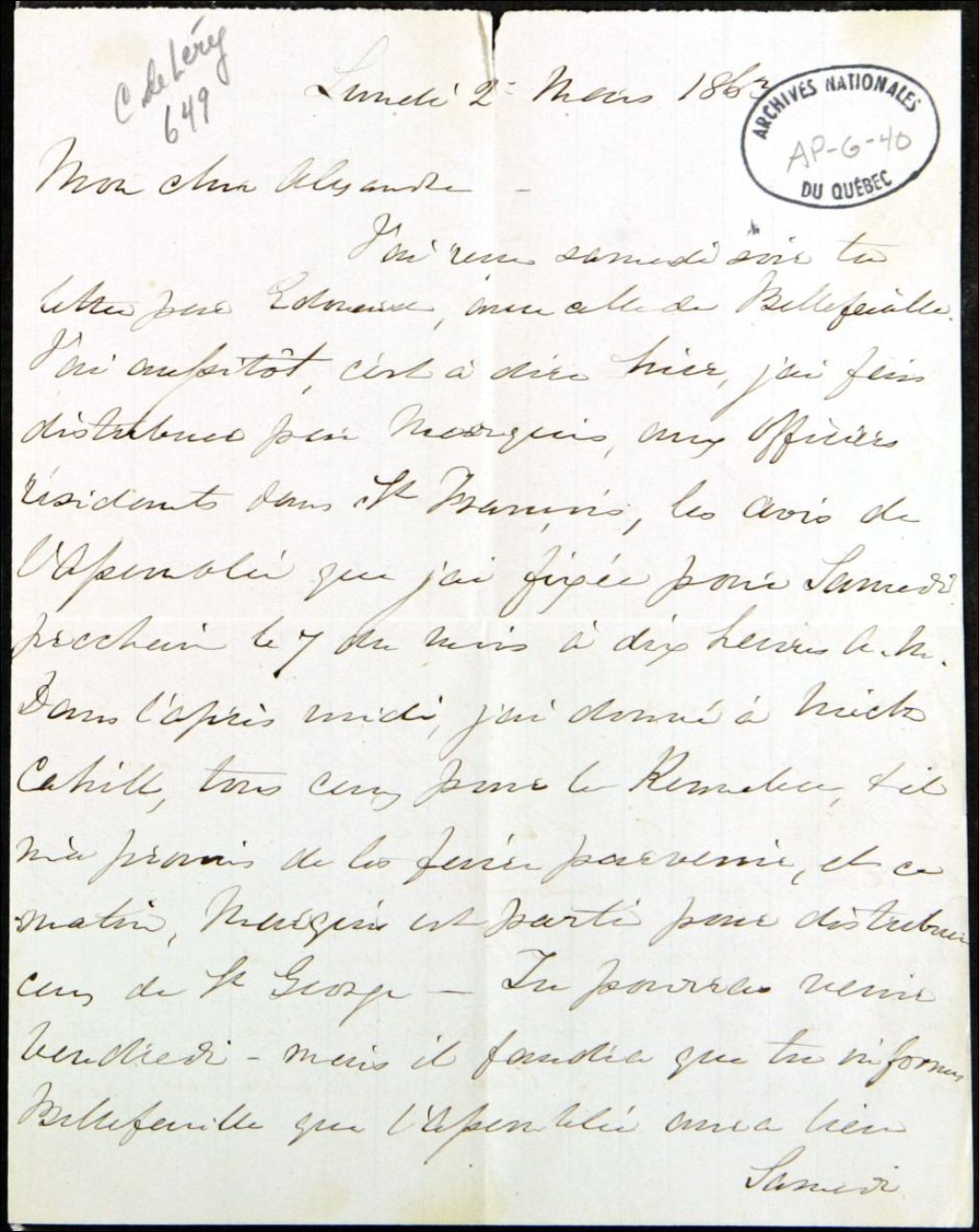 - Il a reçu sa lettre; il a envoyé les avis de l'Assemblée aux officiers résidents à Saint-François; il lui indique qu'il pourra venir à l'Assemblée de samedi mais qu'il devra en informer Bellefeuille; il écrit qu'il a des nouvelles des chevaux de Holden; il donne des nouvelles de ses voisins Hilton et Cahill; il mentionne que les docteurs Roy et Lafleur ont passé la soirée de la veille chez lui. Ils ont fait une enquête sur le corps de la femme de Julien Menorche; il lui donne de ses nouvelles et les embrasse tous; il lui envoie la lettre pour Couillard et pour Bellefeuille. Il lui demande de renvoyer la lettre pour Bellefeuille à Québec ou de la donner à Pierre Blouin