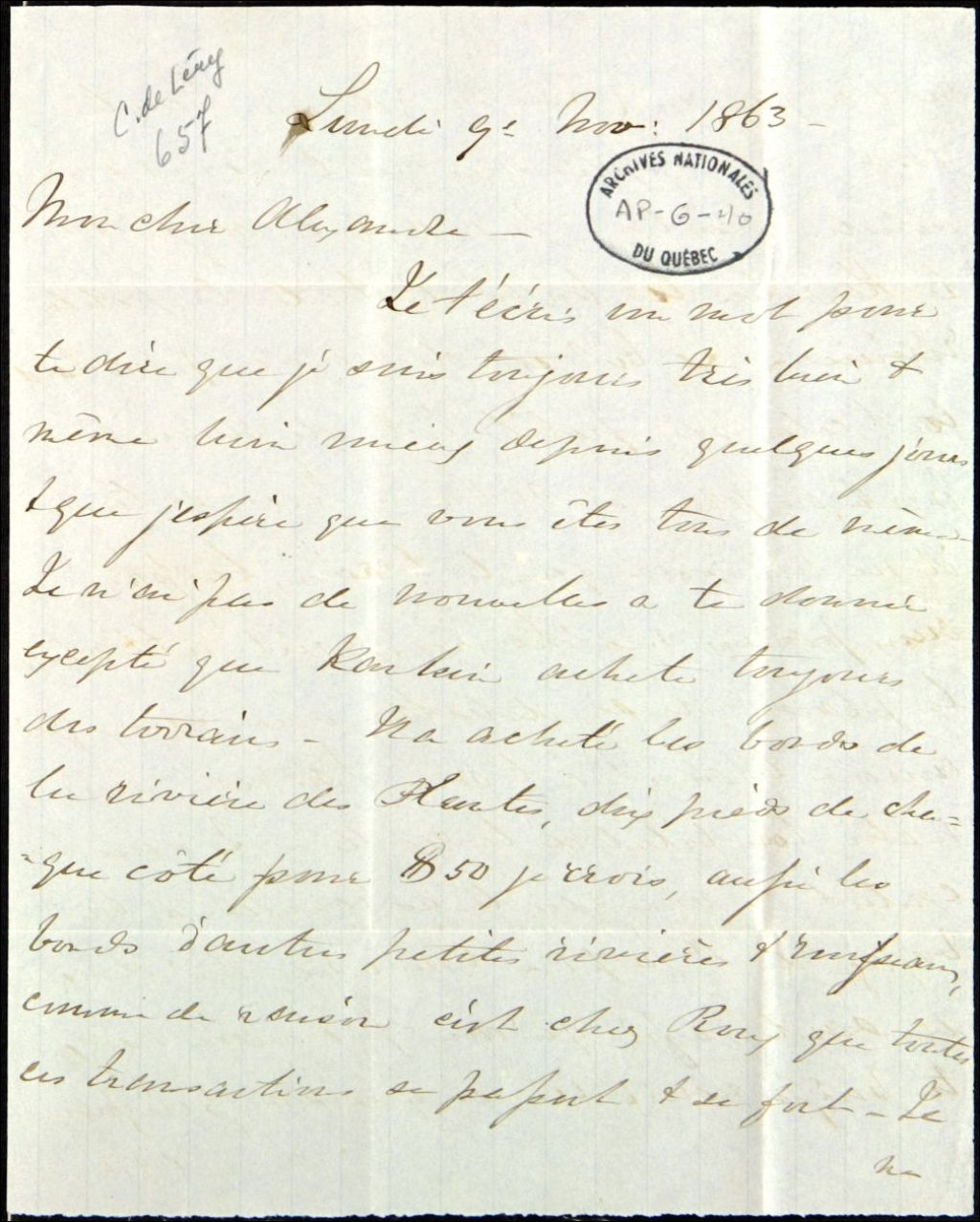 Lettre de Charles-Joseph Chaussegros de Léry à son frère Alexandre-René Chaussegros de Léry, 9 novembre 1863, Archives nationales à Québec, Fonds Famille Chaussegros de Léry, (03Q,P386,D657).
