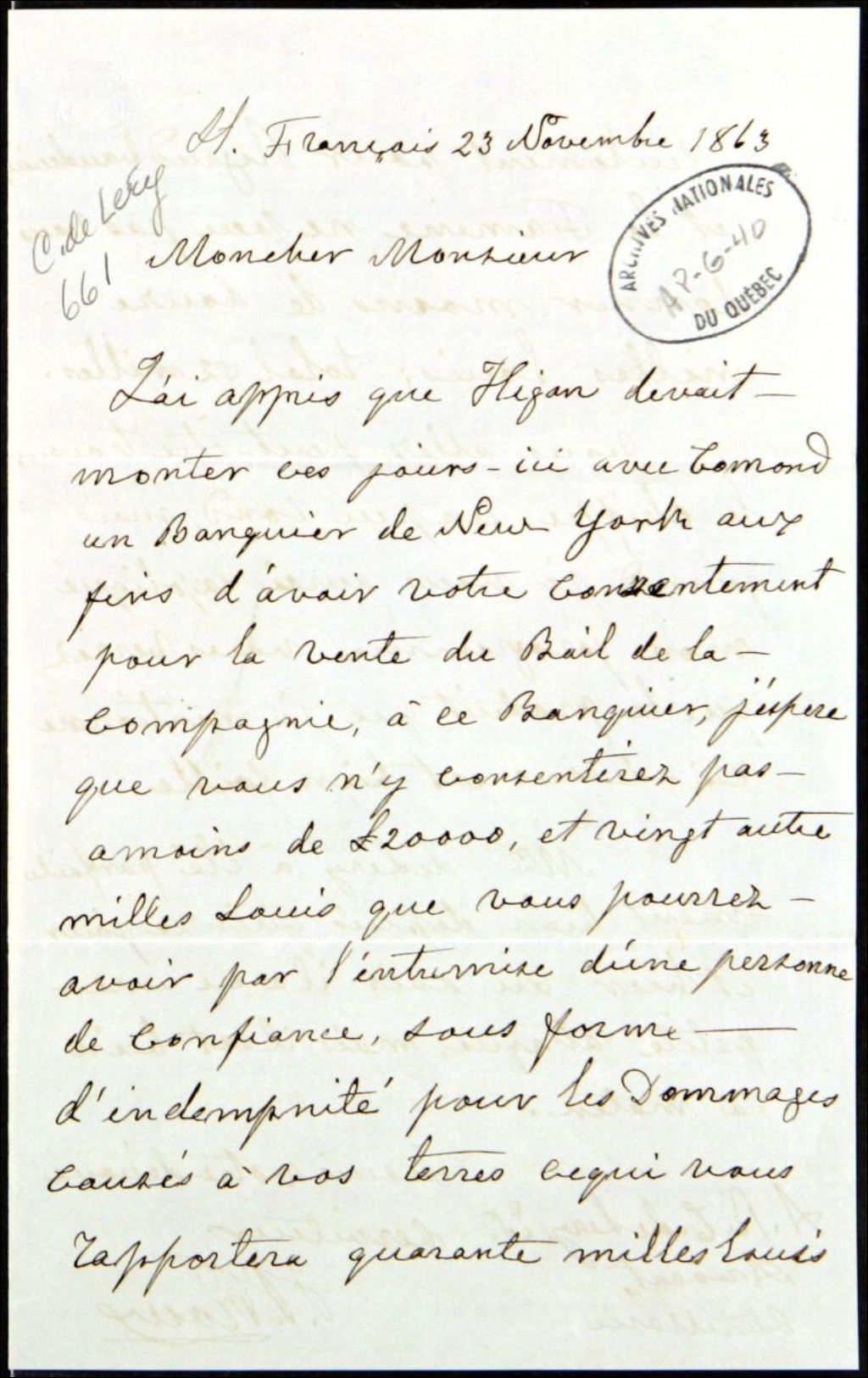 - Il a appris que Higan devait monter avec un banquier de New York pour avoir le consentement d'Alexandre-René pour la vente du bail de la compagnie. Il espère qu'il ne le vendra pas à moins de 20 000 louis et d'un autre 20 000 louis sous forme d'indemnité pour les dommages causés à ses terres de Rigaud-Vaudreuil. Il indique que la rivière la Famine ne peut lui rapporter moins de 12 000 louis; il l'informe que Charles-Joseph a eu une petite attaque la veille au soir