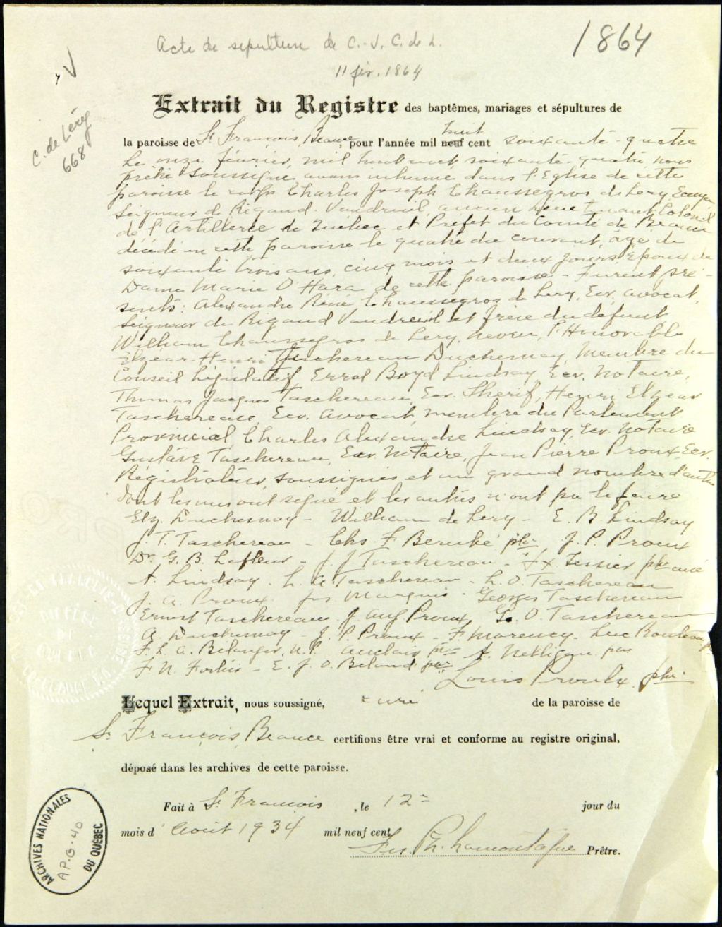 Acte de sépulture de Charles-Joseph Chaussegros de Léry, 11 février 1864, Archives nationales à Québec, Fonds Famille Chaussegros de Léry, (03Q,P386,D668).
