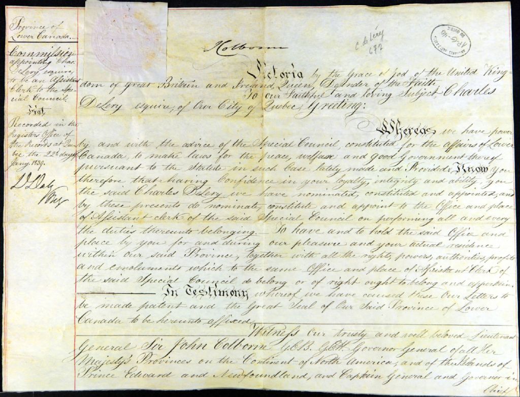 Commission de John Colborne nommant Charles-[Joseph Chaussegros] de Léry assistant greffier du Conseil spécial, 22 janvier 1839, Archives nationales à Québec, Fonds Famille Chaussegros de Léry, (03Q,P386,D672).