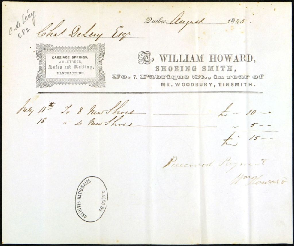 - Reçus de Charles-Joseph Chaussegros de Léry - ils sont faits à l'intention de particuliers, du Quebec Fire Office, du Phoenix Fire Assurance Company of London, et de William Howard, Shoeing Smith