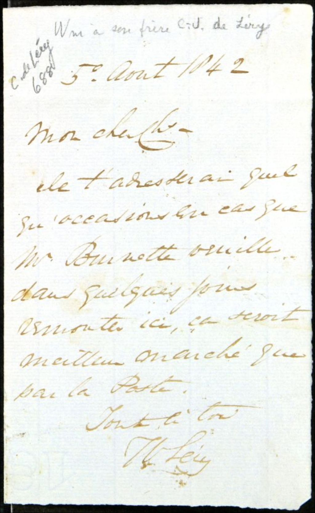 Version intégrale légèrement normalisée : «5e Aout 1842. Mon cher Chs [Charles] je t'adresserai quel qu'occasion en cas que M. Burnette [Burnett] veuille dans quelques jours remonter ici, ça seroit meilleur marché que par la poste. Tout à toi. W Lery»