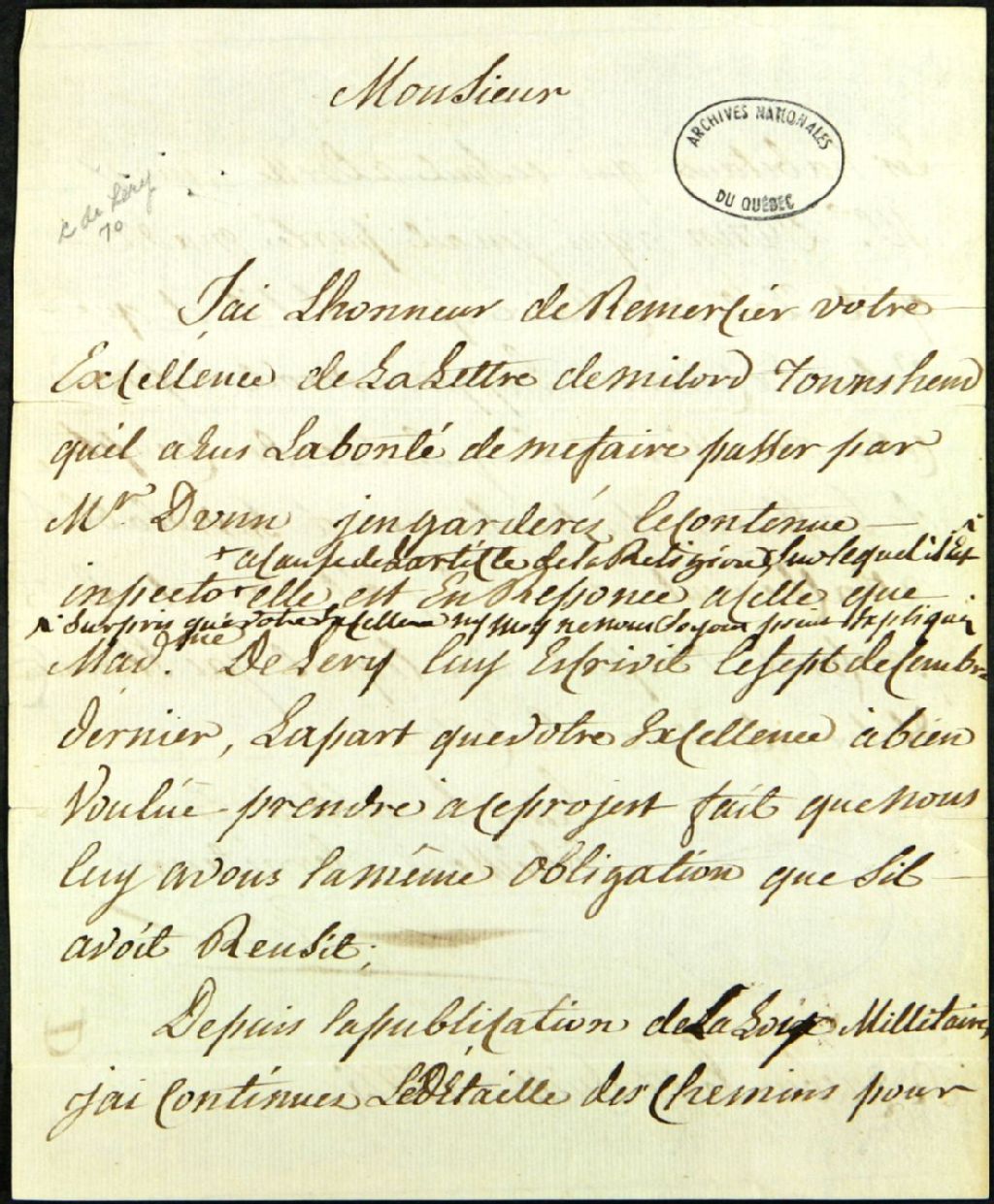 Version intégrale légèrement normalisée : «Monsieur, J'ai l'honneur de remercier votre excellence de la lettre de milord Townshend qu'il a eu la bonté de me faire passer par monsieur Dunn j'en garderai le contenue in petto à cause de l'article de la religion sur lequel il est surpris que votre excellence ni moi ne nous soyons point expliqués elle est en réponse à celle que madame de Lery lui écrivit le sept décembre dernier, la part que votre excellence a bien voulu prendre à ce projet fait que nous lui avons la même obligation que s'il avait réussit; Depuis la publication de la loi militaire j'ai continué le détail des chemins pour les habitants qui se sont adressé à moi monsieur Dunn à qui j'en ai parlé m'a dit qu'il était nécessaire que je le fis et que votre excellence l'approuverait, je prend cette occasion de lui en rendre compte, de l'assurer du très sincère et inviolable attachement que je lui ait voué, et du profond respect [...]