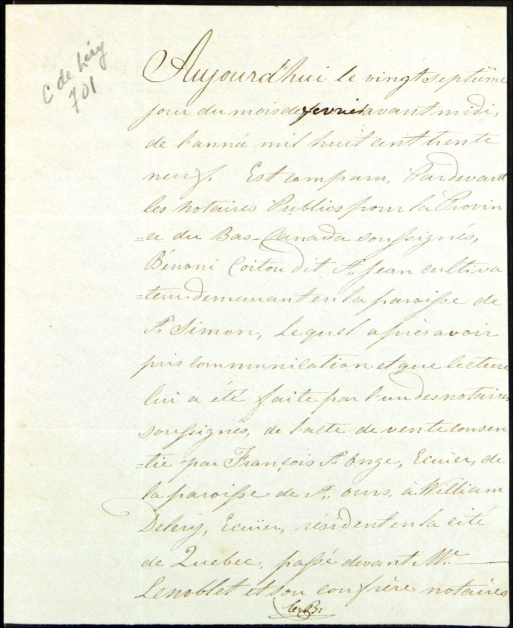 - Acte notarié fait par le notaire Charles Bazin - il s'agit d'actes de vente de terrain à William Chaussegros de Léry, notaire de Québec, par Benoni Coitou dit Saint-Jean, cultivateur de la paroisse de Saint-Simon, et Simon Pin, cultivateur de la paroisse de Contrecoeur