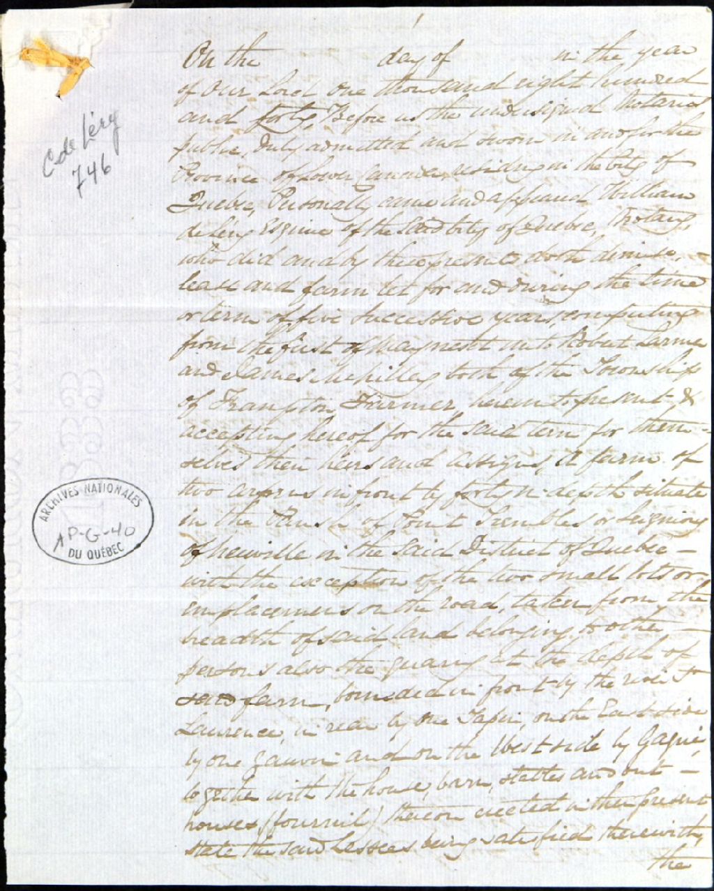 - Acte notarié fait par un notaire dont le nom n'est pas mentionné - il s'agit d'une location à bail d'une ferme située dans la paroisse de la Pointe-aux-Trembles dans la seigneurie de Neuville par William Chaussegros de Léry, notaire de Québec, à Robert Larmer et James McHilley, du township de Frampton Farmer