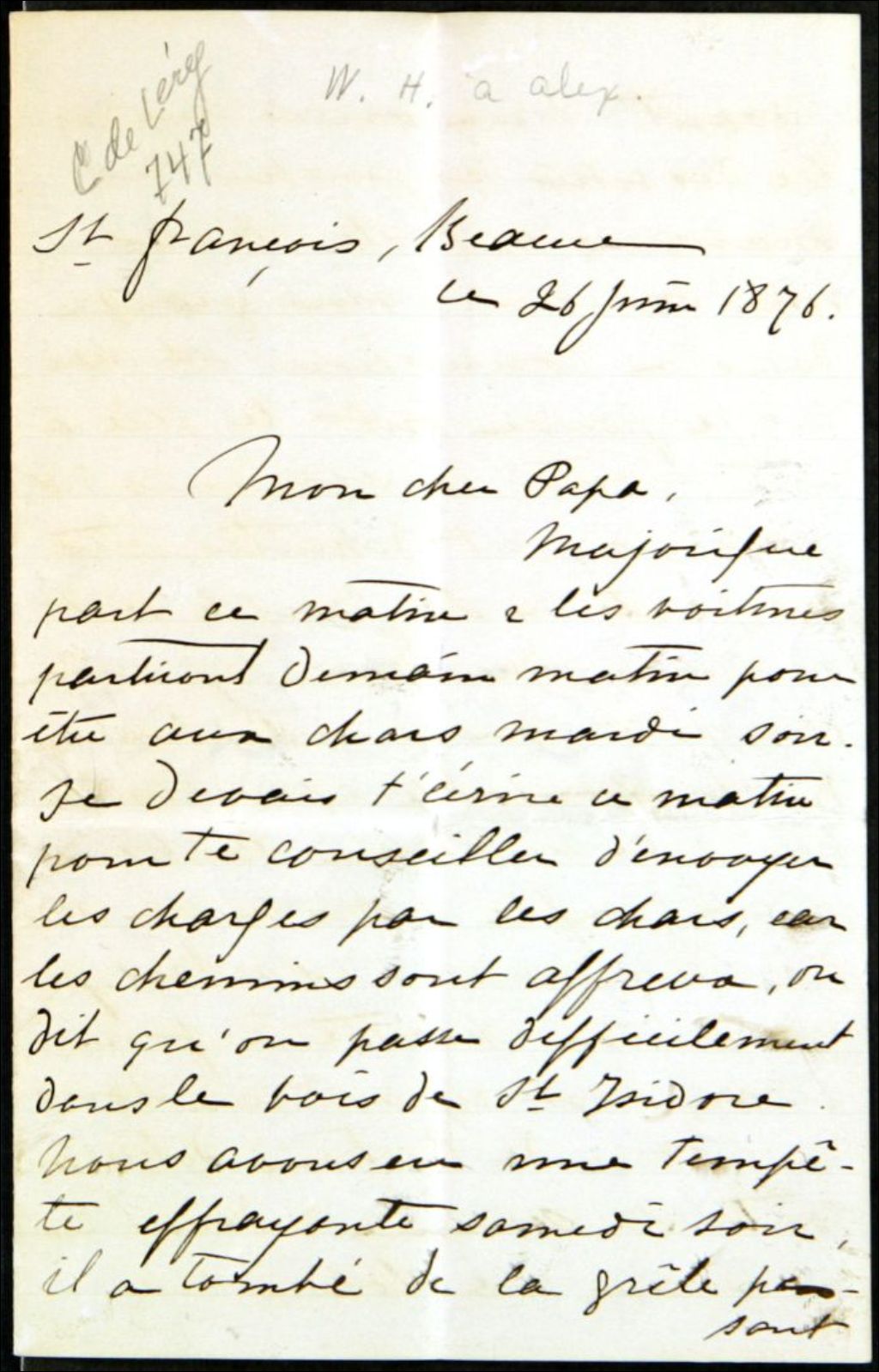 - Il indique à son père qu'un nommé Majorique part ce matin et que les voitures partiront le lendemain pour être aux chars le mardi soir. Il va réécrire à son père pour qu'il envoie les charges par les chars; les chemins sont affreux et on passe difficilement dans le bois de Saint-Isidore; il raconte qu'il y a eu tempête le samedi précédent; il affirme que l'évêque doit arriver aujourd'hui; il écrit à propos d'un voyage qu'il a dû retarder au lendemain matin en raison de la pluie