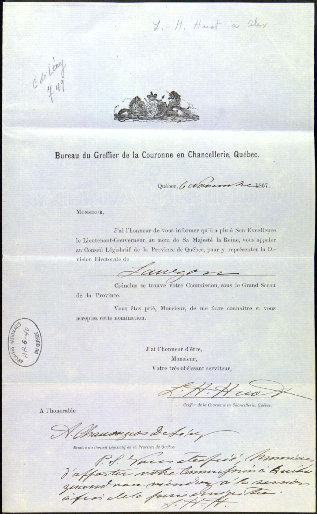 Commission pour représenter la division électorale de Lauzon accordée à Alexandre-René Chaussegros de Léry, membre du Conseil législatif de la province de Québec, par L.-H. Huot, greffier de la Couronne en Chancellerie