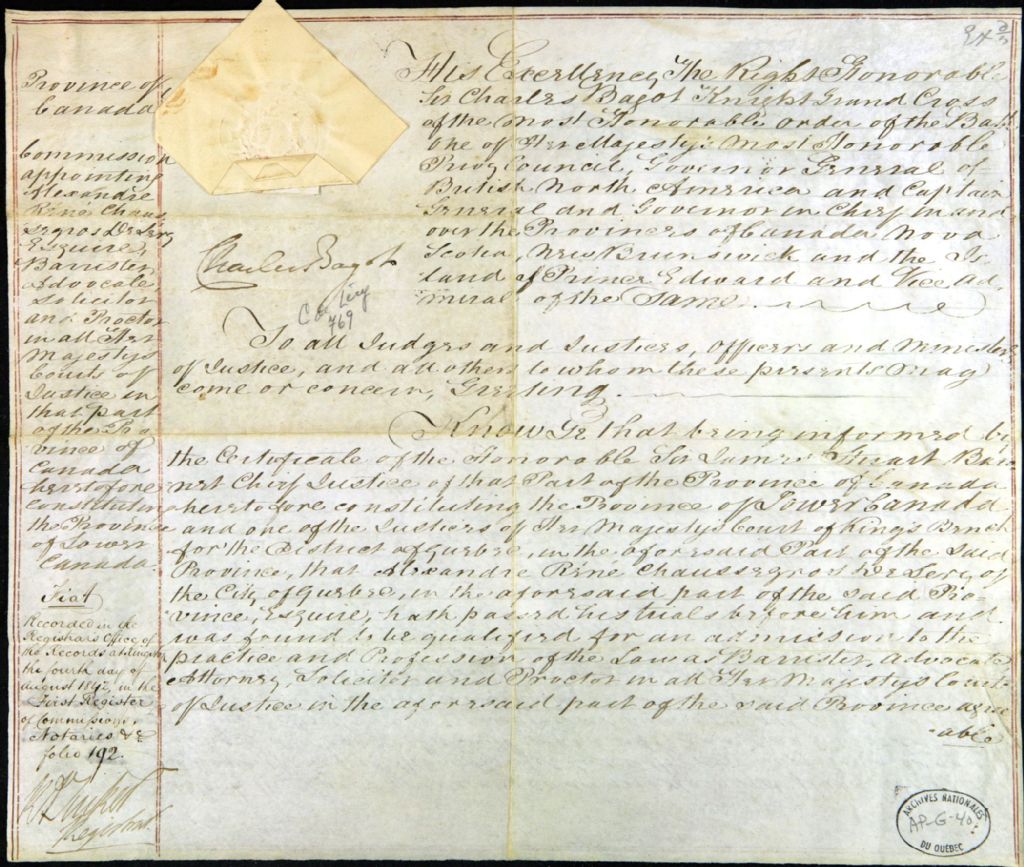Commission d'avocat accordée à Alexandre-René Chaussegros de Léry par Son Excellence le gouverneur général Charles Bagot, 28 juillet 1842, Archives nationales à Québec, Fonds Famille Chaussegros de Léry, (03Q,P386,D769).