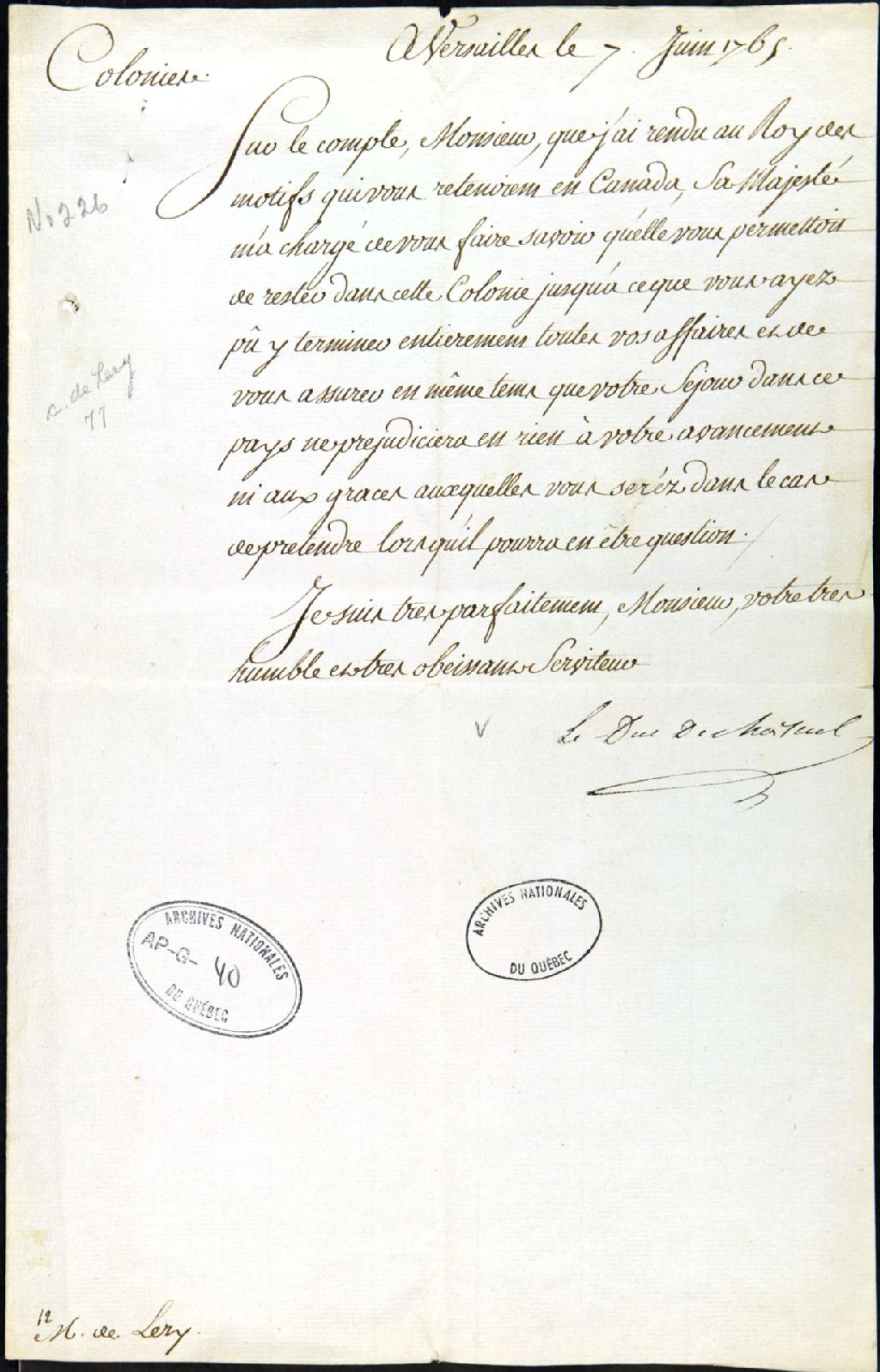 - Version intégrale légèrement normalisée : «À Versailles le 7 juin 1765. Sur le compte, monsieur, que j'ai rendu au Roi des motifs qui vous retenaient en Canada, Sa Majesté m'a chargé de vous faire savoir qu'elle vous permettait de rester dans cette colonie jusqu'à ce que vous ayez pu y terminer entièrement toutes vos affaires et de vous assurer en même temps que votre séjour dans ce pays ne préjudiciera en rien à votre avancement ni aux grâces auxquelles vous serez dans le cas de prétendre lorsqu'il pourra en être question. Je suis très parfaitement, monsieur, votre très humble et très obéissant serviteur, LE DUC DE CHOISEUL»