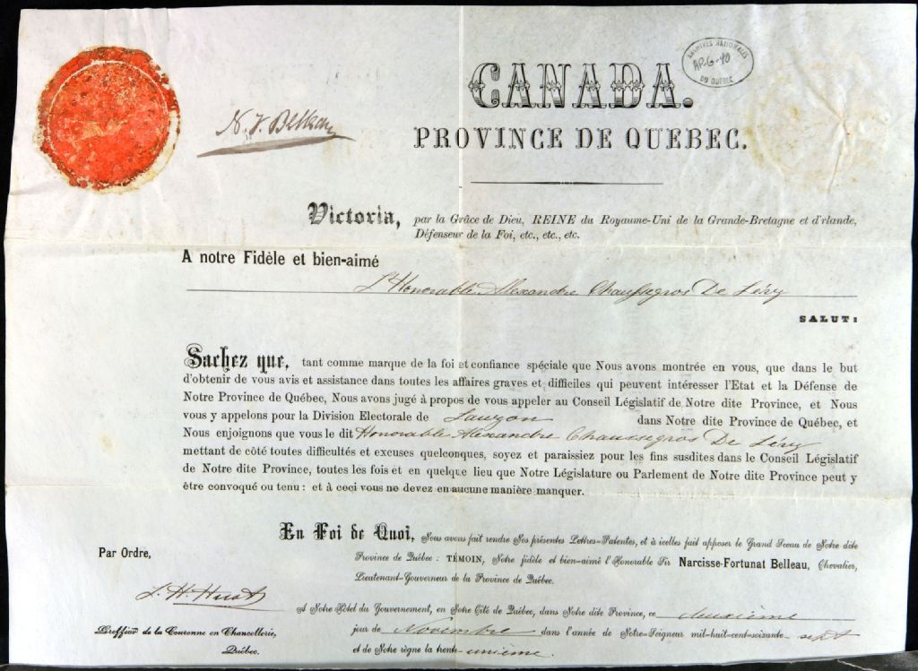 Lettres patentes appelant Alexandre-René Chaussegros de Léry pour la division électorale de Lauzon au Conseil législatif de la province de Québec, 15 janvier 1868, Archives nationales à Québec, Fonds Famille Chaussegros de Léry, (03Q,P386,D772).