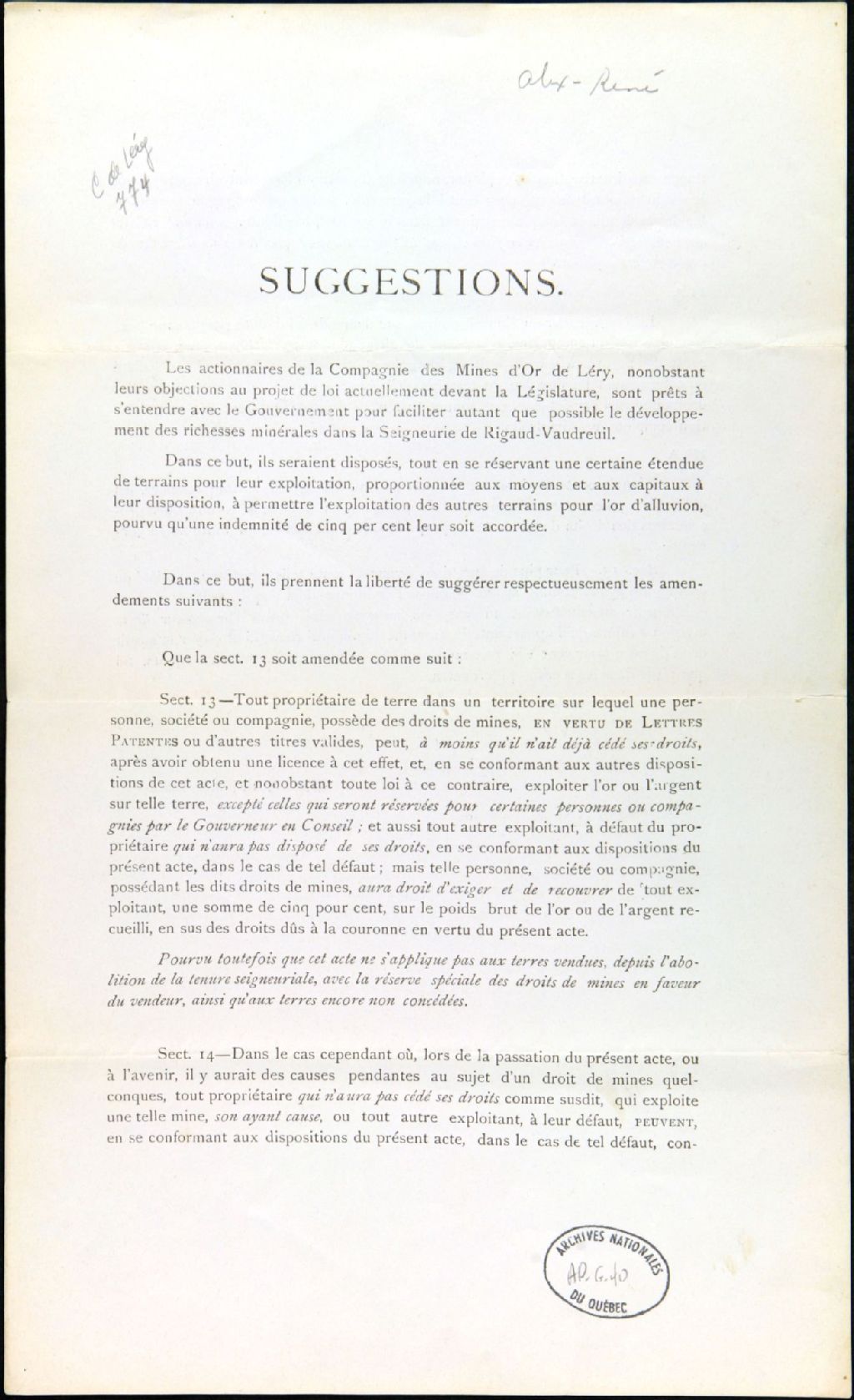 Suggestions d'amendements faites par les actionnaires de la «De Léry Gold Mining» au projet de loi devant la Législature afin de faciliter autant que possible le développement des richesses minérales dans la seigneurie de Rigaud-Vaudreuil, 15 juillet 1880, Archives nationales à Québec, Fonds Famille Chaussegros de Léry, (03Q,P386,D774).