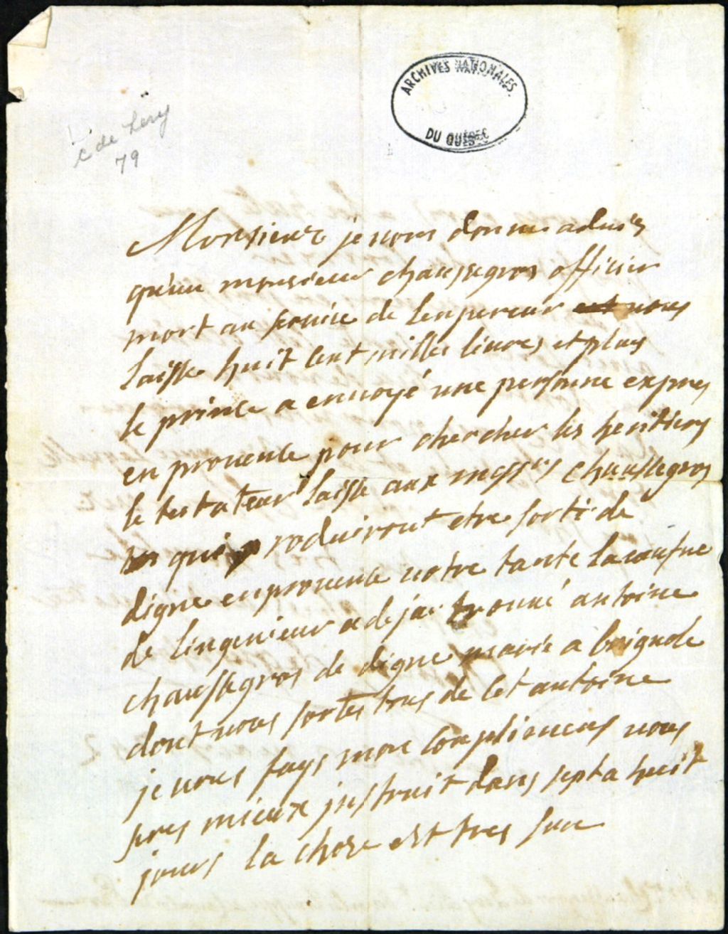 - Version intégrale légèrement normalisée : «Monsieur je vous donne avis qu'un monsieur Chaussegros officier mort au service de l'empereur vous laisse huit cent milles livres et plus le prince a envoyé une personne exprès en Provence pour chercher les héritiers le testateur laisse aux messieurs Chaussegros qui produiront être sorti de Digne en Provence notre tante la veuve de l'ingénieur a déjà trouvé Antoine Chaussegros de Digne marié a Blignole dont vous sortez tous de cet Antoine je vous fais mon compliment. Vous serez mieux instruit dans sept à huit jours la chose est très sûre. je vous écris à la hâte pour profiter du courrier je désire que vous en jouissiez avec longue santé cette occasion nous donnera lieu de vous voir dans ce pays pour vous marquer toute l'estime et l'amitié avec laquelle j'ai l'honneur d'être Monsieur Votre très humble et très obéissant serviteur. Demine de Quinzon. À Toulon ce 2 mars 1752. À monsieur Chaussegros [...]