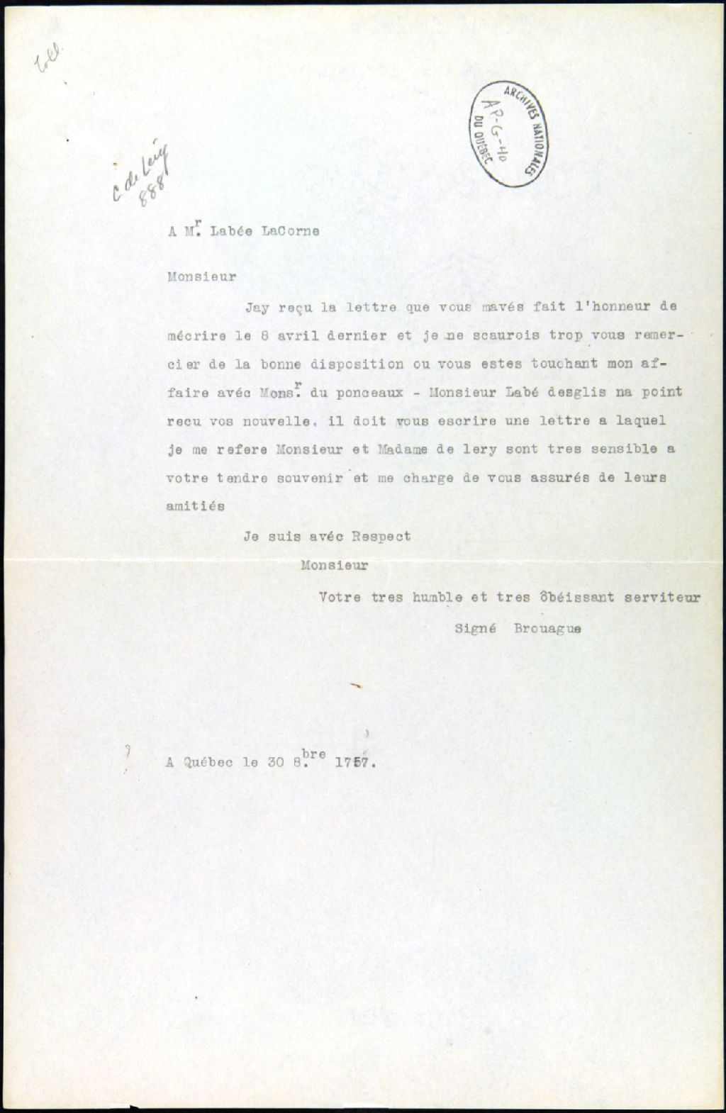 - Version intégrale légèrement normalisée : «À monsieur l'abbé LaCorne MonsieurJ'ai reçu la lettre que vous m'avez fait l'honneur de m'écrire le 8 avril dernier et je ne saurais trop vous remercier de la bonne disposition où vous êtes touchant mon affaire avec monsieur du Ponceaux ¿ monsieur l'abbé Desglis [D'Esglis, Desgly] n'a point reçu vos nouvelle il doit vous écrire une lettre à laquelle je me réfère monsieur et madame de Lery sont très sensible à votre tendre souvenir et me charge de vous assurez de leurs amitiés. Je suis avec respect Monsieur Votre très humble et très obéissant serviteur Signé Brouague À Québec le 30 octobre 1757.»
