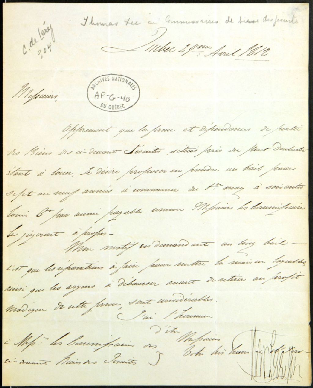 Lettre de Thomas Lee aux commissaires des biens des Jésuites, 29 avril 1812, Archives nationales à Québec, Fonds Famille Chaussegros de Léry, (03Q,P386,D904).