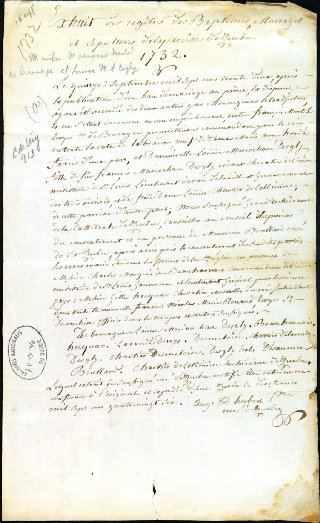 Extrait de mariage entre François Martel de Brouague et Louise [Madeleine] Mariauchau Desgly D'Esglis, Desglis), 15 septembre 1715, Archives nationales à Québec, Fonds Famille Chaussegros de Léry, (03Q,P386,D913).