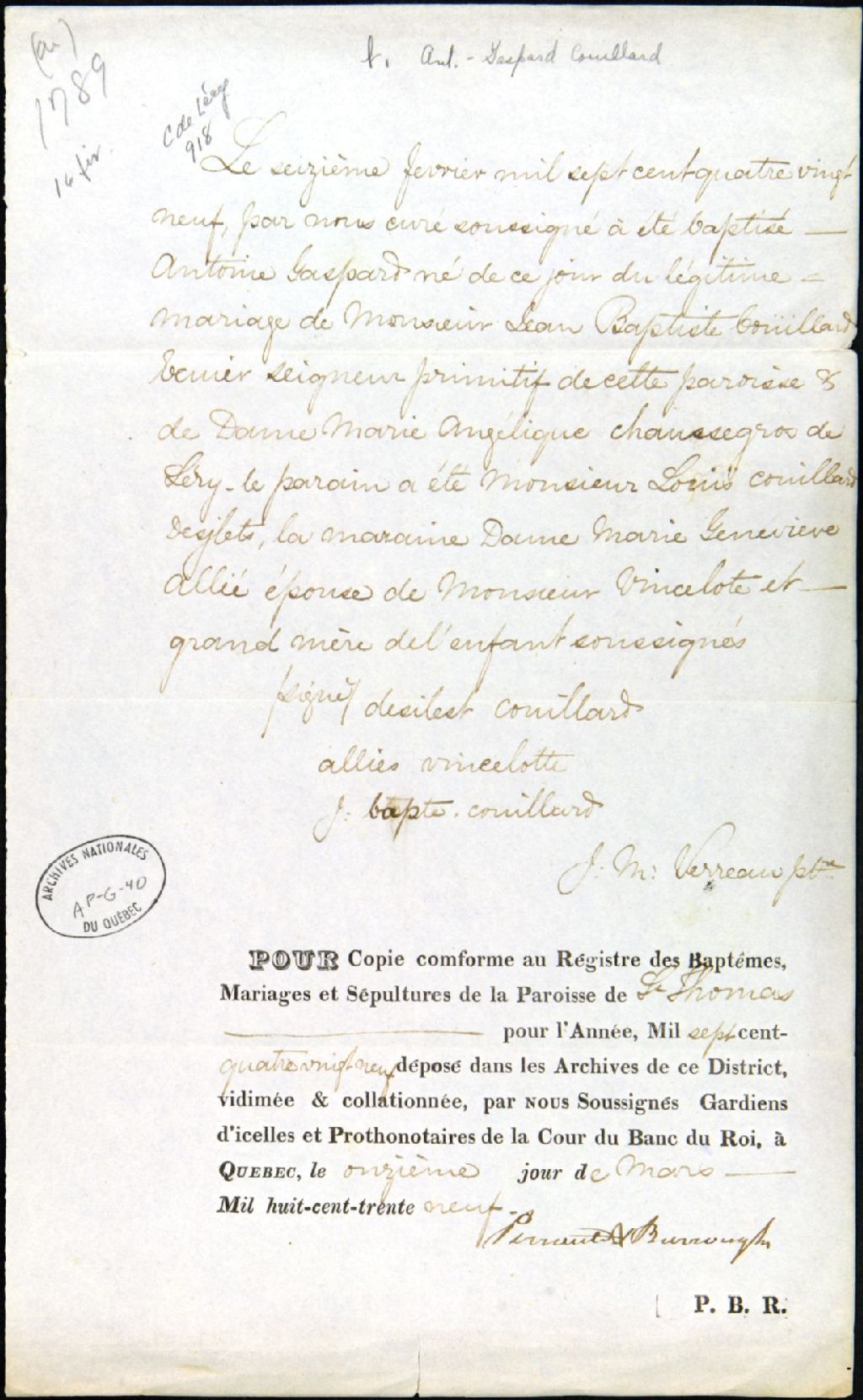 Extrait baptistaire d'Antoine-Gaspard Couillard, 16 février 1789, Archives nationales à Québec, Fonds Famille Chaussegros de Léry, (03Q,P386,D918).
