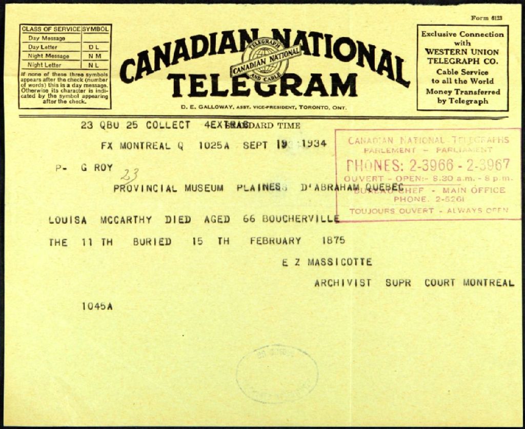 Cahiers de notes de Pierre-Georges Roy, archiviste - il s'agit de notes concernant les actes de naissance, baptême, mariage et sépulture liées aux membres de la famille Chaussegros de Léry aux 18e et 19e siècles, Entre le 1er janvier 1900 et le 31 décembre 1944, Archives nationales à Québec, Fonds Famille Chaussegros de Léry, (03Q,P386,D945).