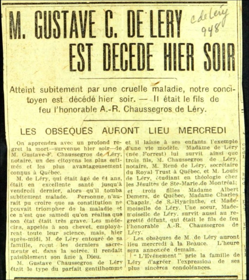 - Articles nécrologiques en lien avec la famille Chaussegros de Léry ainsi qu'une lettre d'Antoine-Gaspard Couillard à son oncle Charles Chaussegros de Léry