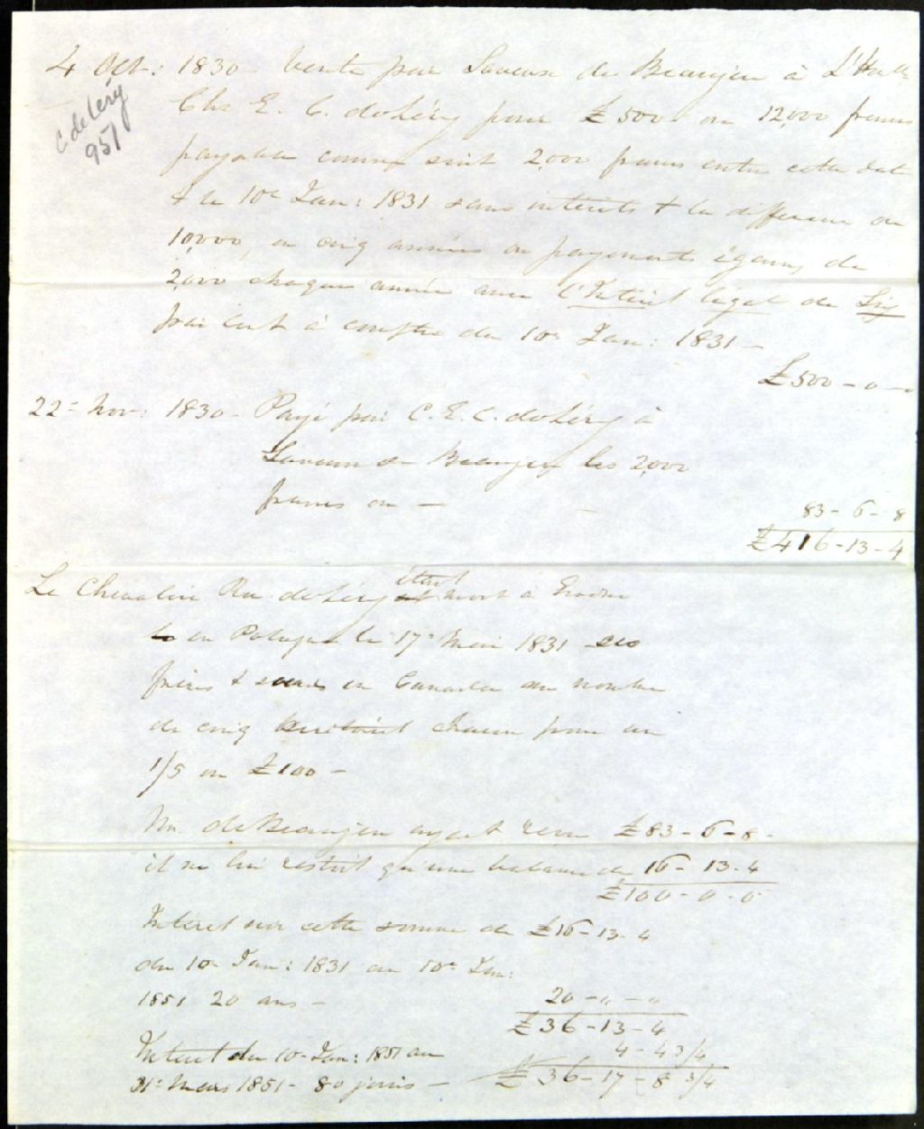 Extrait de transactions financières concernant la succession de l'oncle Georges de Jacques-Philippe Saveuse de Beaujeu, 10 janvier 1851 au 31 mars 1851, Archives nationales à Québec, Fonds Famille Chaussegros de Léry, (03Q,P386,D951).