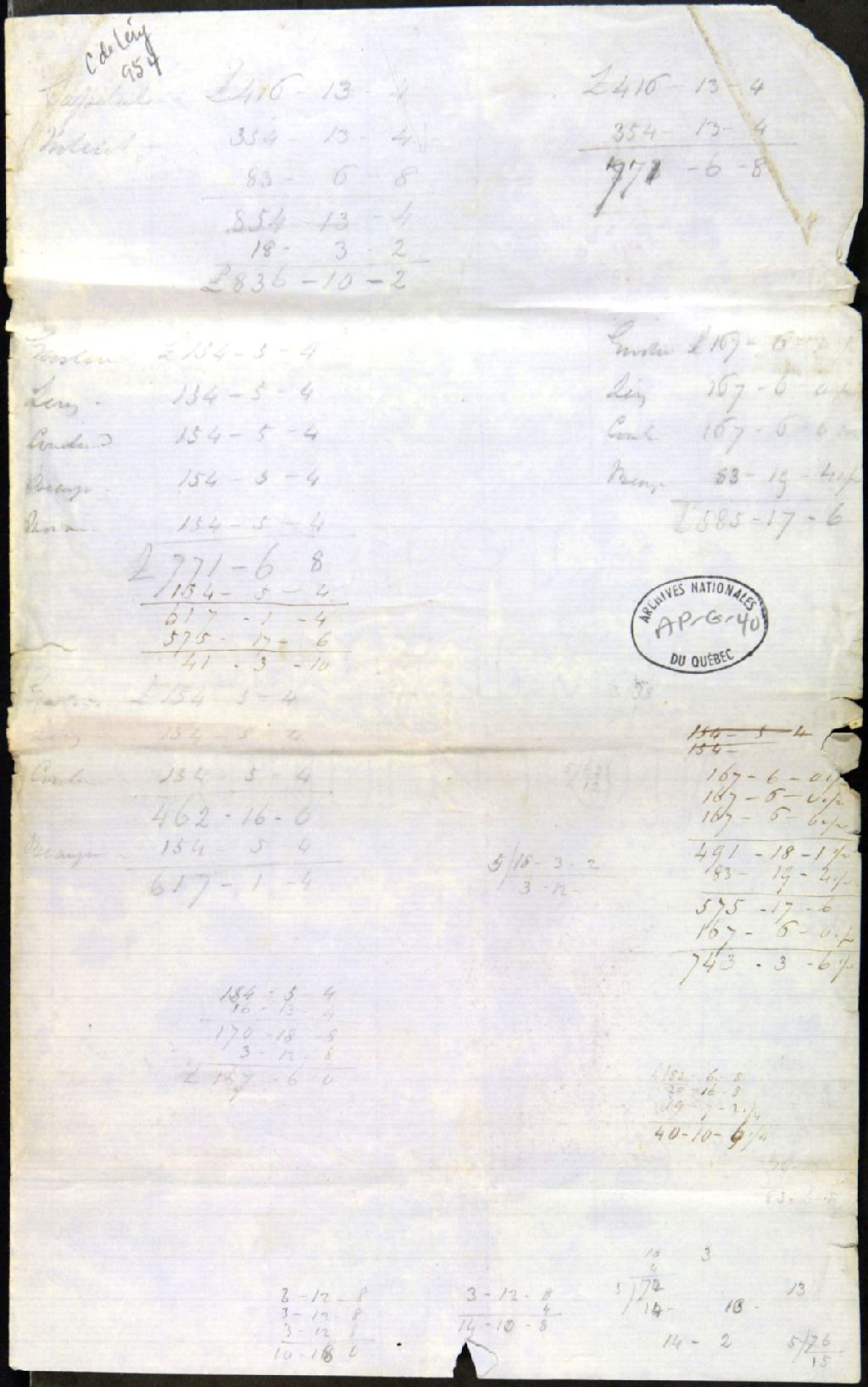 Papier de Jacques-Philippe Saveuse de Beaujeu intitulé «Affaire de Beaujeu relativement à la succession de feu mon oncle George» - il s'agit d'un papier comportant quelques données financières, Entre le 1er janvier 1850 et le 31 décembre 1870, Archives nationales à Québec, Fonds Famille Chaussegros de Léry, (03Q,P386,D954).