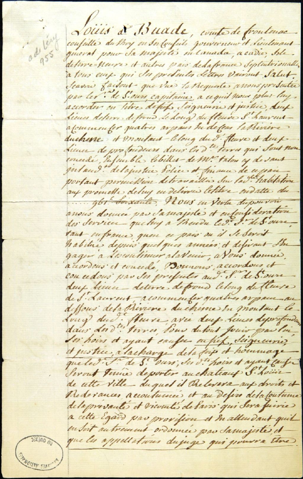 Version intégrale légèrement normalisée : «Louis de Buade, comte de Frontenac conseillé du Roi en ses conseils gouverneur et lieutenant général pour Sa Majesté en Canada, Acadie, île de Terre-Neuve et autres pays de la France septentrionale à tous ceux qui ses présentes lettres verront, Salut; savoir faisons que vue la requête à nous présentée par le sieur de St-Ours [Saint-Ours], capitaine à ce qu'il nous plût lui accorder en titre de fief, seigneurie et justice, deux lieues de terre de fond le long du fleuve St-Laurent à commencer quatre arpents en deçà la rivière Duchene et montant le long dudit fleuve et deux lieues de profondeurs dans lesdites terres qui sont non concédé, ensemble le billet de monsieur Talon ci-devant intendant de la justice, police et finance de ce pays portant permission de travailler sur la dite habitation aux promesse de lui en délivrer le titre en date du [. . . ] mille six cent soixante, nous en vertu du [...]