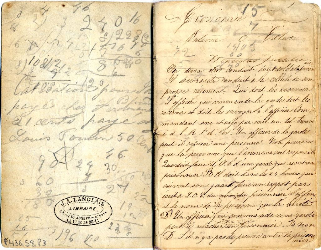 Calepin dans lequel Wenceslas Turcotte décrivait toutes les tâches à accomplir pendant qu'il était lieutenant dans la milice
