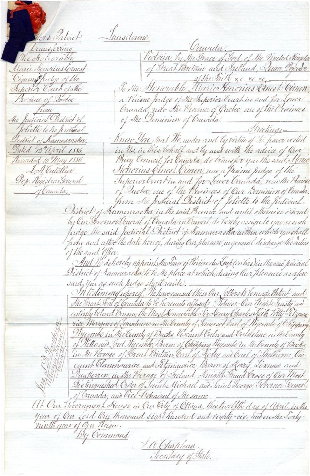 Lettres patentes transférant Marie Honorius Ernest Cimon, "puisné judge of the Superior Court of the province of Quebec" du district judiciaire de Joliette au district judiciaire de Kamouraska, 12 avril 1886, Archives nationales à Québec, Fonds Famille Pouliot, (03Q,P436,S999,P100).