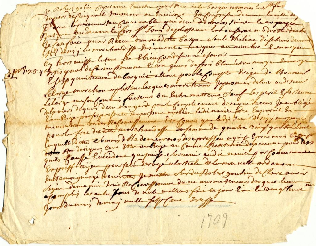 Connaissement de la cargaison de la barque "La Sainte-Famille" jaugeant 50 tonneaux., 28 mai 1713, Archives nationales à Québec, Fonds Famille Pouliot, (03Q,P436,S999,P31).