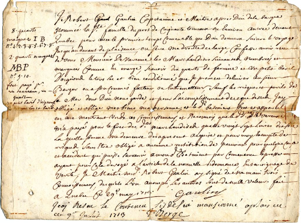 Reconnaissance de Robert Gaulin, capitaine de la barque "La Sainte-Famille" pour marchandises reçues