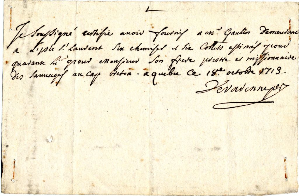 Certificat d'origine de marchandises, en l'occurence de six chemises et six "cottes", d'une valeur de 40 livres, expédiées à l'abbé Antoine Gaulin, missionnaire auprès des "sauvages" au Cap Breton, via son frère Robert Gaulin, 18 octobre 1713, Archives nationales à Québec, Fonds Famille Pouliot, (03Q,P436,S999,P34).
