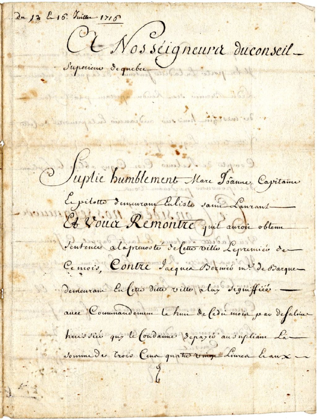 Pétition au Conseil supérieur de Marc Joanne, capitaine et pilote de l'Île d'Orléans, demandant que Jacques Bernier, maÎtre de barque, lui rembourse 380 livres, 1716, Archives nationales à Québec, Fonds Famille Pouliot, (03Q,P436,S999,P38).