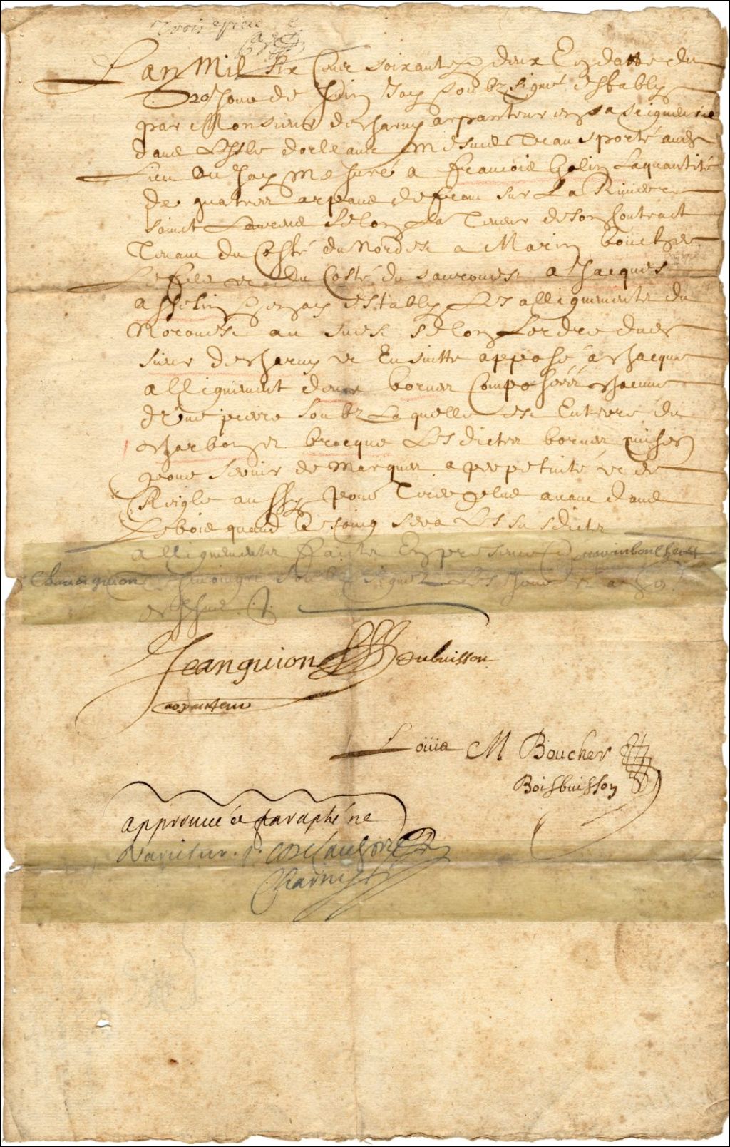 Arpentage de la terre de François Gaulin de l'Île d'Orléans par Jean Guyon du Buisson, fils, 20 juin 1662, Archives nationales à Québec, Fonds Famille Pouliot, (03Q,P436,S999,P5).