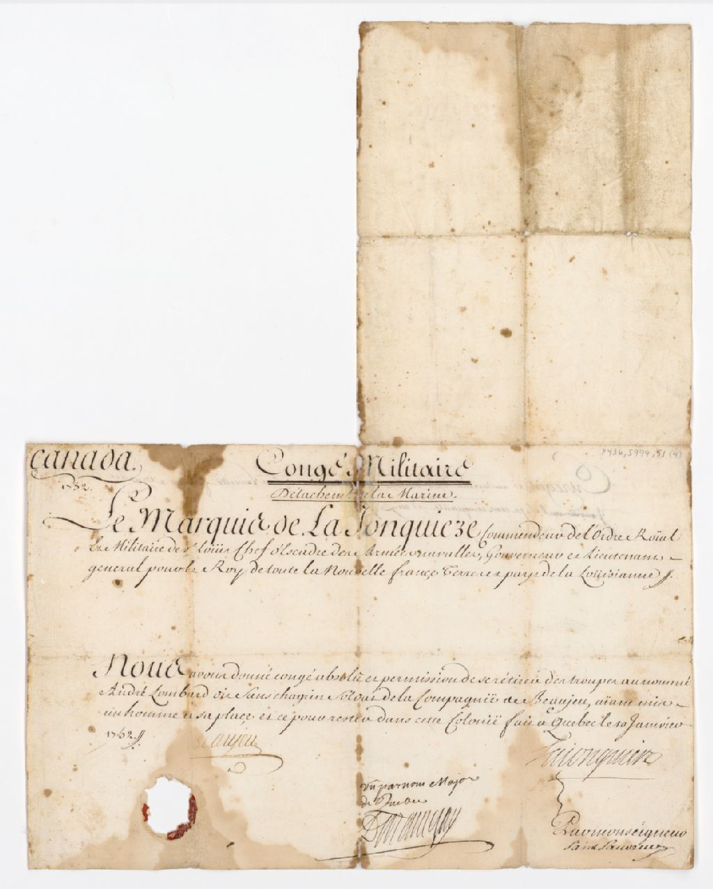 - Le plus important d'entre eux, daté du 10 janvier 1752, est un congé militaire accordé, à André Lombard dit Sanschagrin, soldat de la compagnie de Beaujeu, par le gouverneur de la Jonquière
