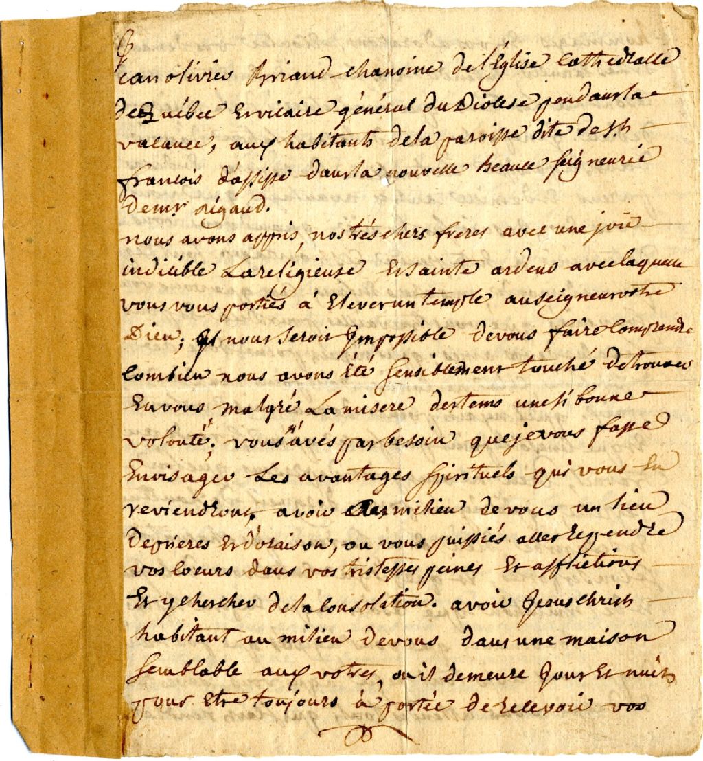 Lettre pastorale de Monseigneur Jean Olivier Briand aux habitants de Saint-François d'Assise de la Nouvelle-Beauce à l'occasion de l'inauguration d'une nouvelle église, 9 mars 1764, Archives nationales à Québec, Fonds Famille Pouliot, (03Q,P436,S999,P61).
