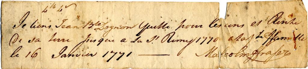 Quittance pour cens et rente à Jean-Baptiste Lognon jusqu'à la Saint-Rémi 1770 par Malcolm Fraser, "seigneur" de l'Île d'Orléans, 16 janvier 1771, Archives nationales à Québec, Fonds Famille Pouliot, (03Q,P436,S999,P69).