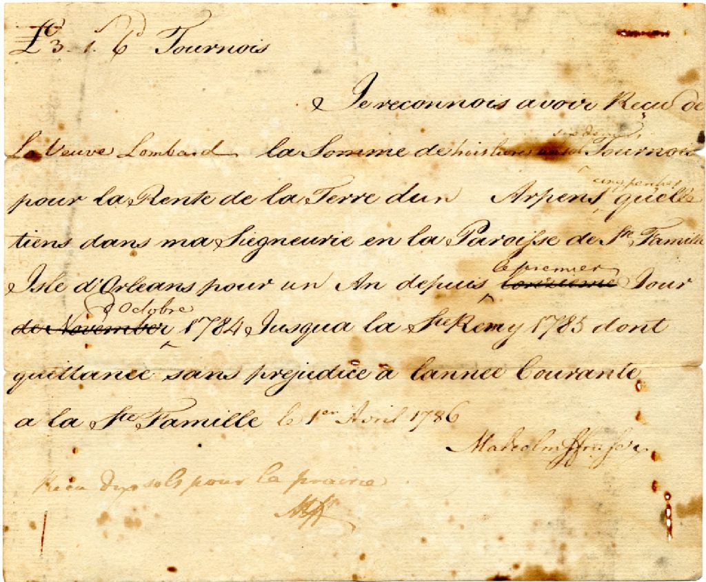Malcolm Fraser reconnaît avoir reçu de la veuve Lombard sa rente de "trois livres, six deniers, un sol Tournois" pour sa terre de la paroisse Sainte-Famille, 1 avril 1786, Archives nationales à Québec, Fonds Famille Pouliot, (03Q,P436,S999,P80).