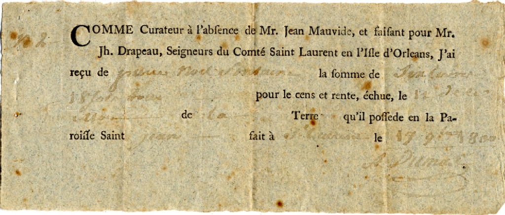 Reçu pour cens et rentes payées par Pierre Noël Jordain pour sa terre de la paroisse de Saint-Jean, 17 novembre 1800, Archives nationales à Québec, Fonds Famille Pouliot, (03Q,P436,S999,P84).