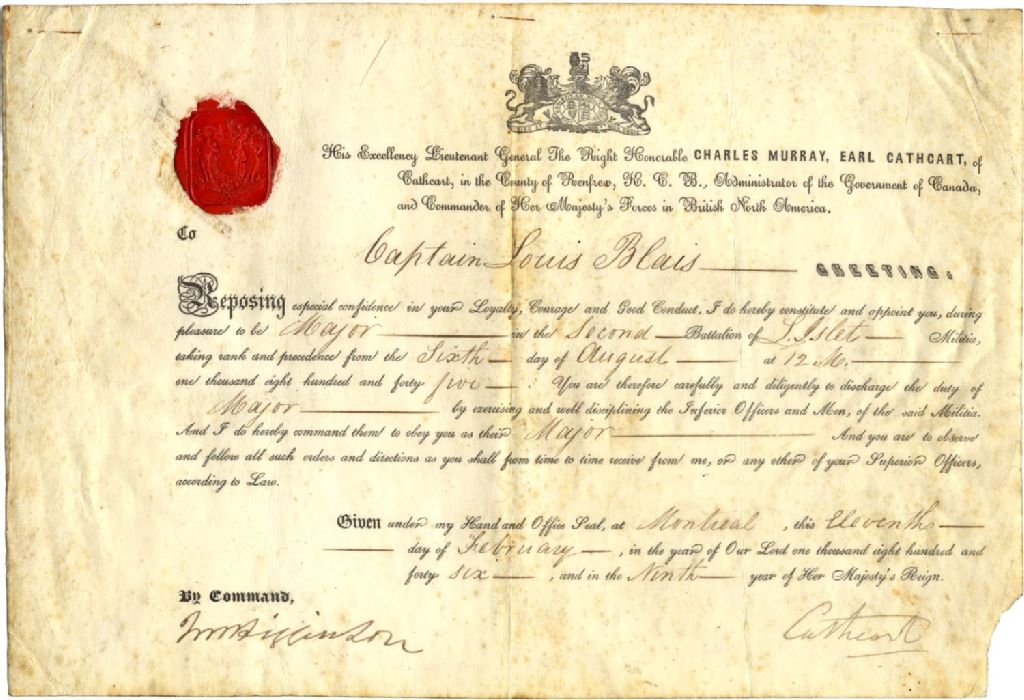 Nomination du capitaine Louis Blais au rang de major du deuxième bataillon des milices du comté de L'Islet, 11 février 1846, Archives nationales à Québec, Fonds Famille Pouliot, (03Q,P436,S999,P92).