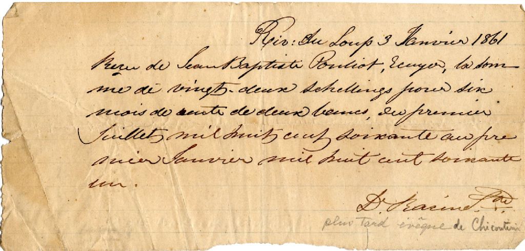 Reçu pour la vente de deux bancs à l'église de Rivière-du-Loup (Fraserville), émis au nom de Jean-Baptiste Pouliot par Dominique Racine, curé et futur évêque de Chicoutimi, 3 janvier 1861, Archives nationales à Québec, Fonds Famille Pouliot, (03Q,P436,S999,P97).
