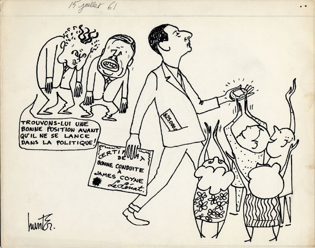 " Trouvons-lui une bonne position avant qu'il ne se lance dans la politique ! "; Certificat de bonne conduite à James Coyne, Le Sénat, 15 juillet 1961, Archives nationales à Québec, Fonds Raoul Hunter, (03Q,P716,S1,P61-07-15), Raoul Hunter.