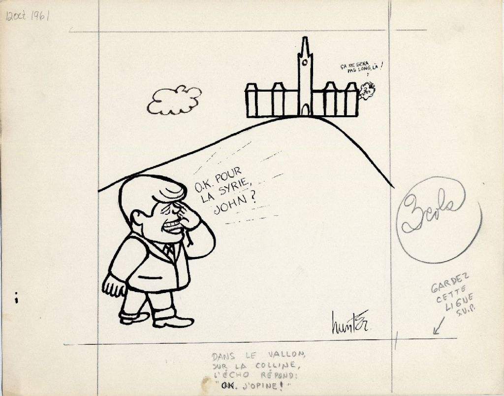 [Kennedy :] " O.K. pour la Syrie John ? [Diefenbaker:] Ça ne sera pas long, là! " Dans le vallon sur la colline, l'écho répond : " O.K., j'opine! "